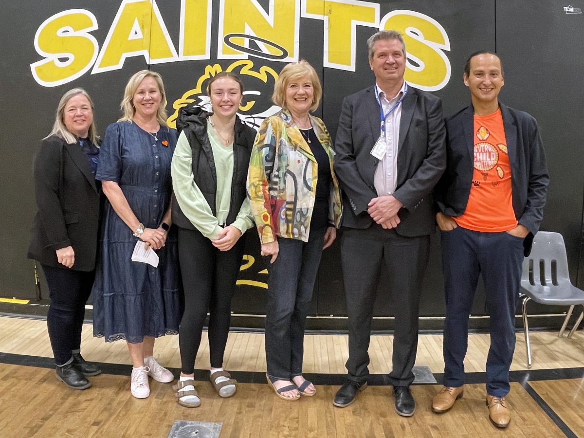 Cadmus Delorme (right) with BGSD Board Chair Esther Eckert (centre), Superintendent Michael Borgfjord, New Sarepta Community High School Assistant Principal Michelle Havereon (left) and Principal Lorelei Steffler.
