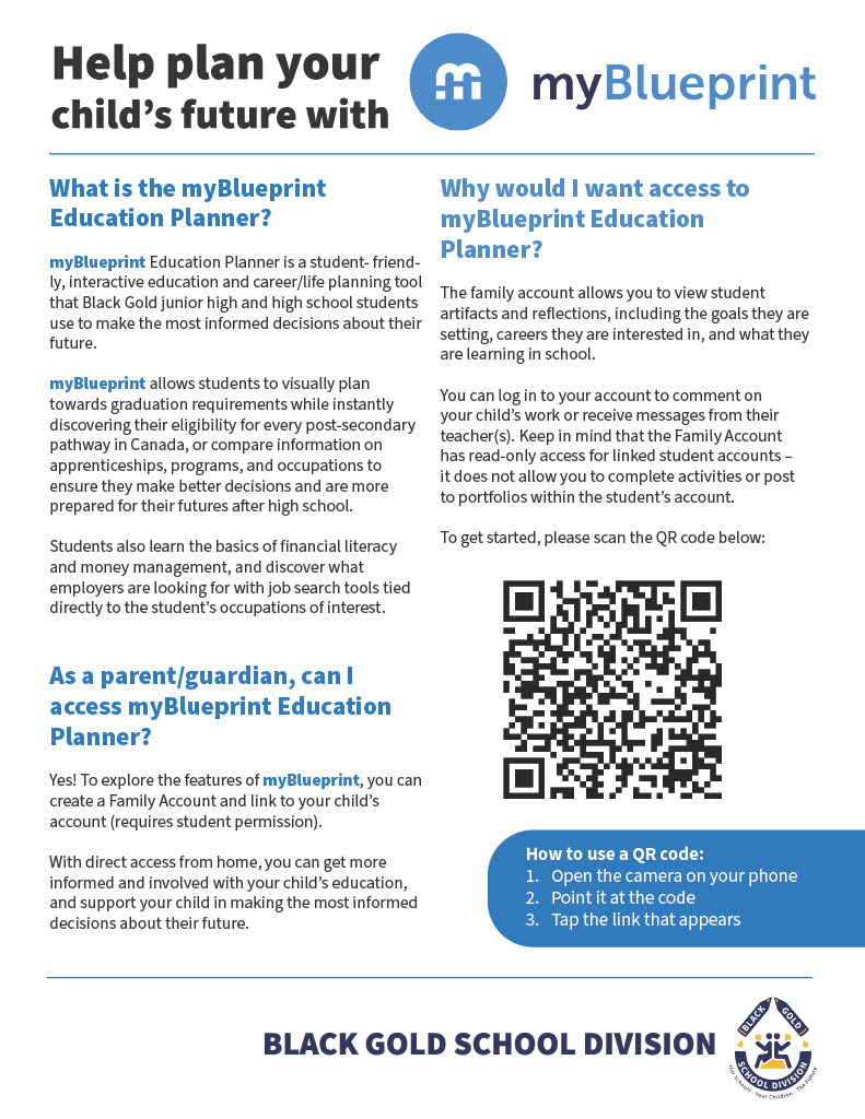 MyBlueprint is available to all students/parents in grades 7-12. Click on the image above to see more information on MyBlueprint.