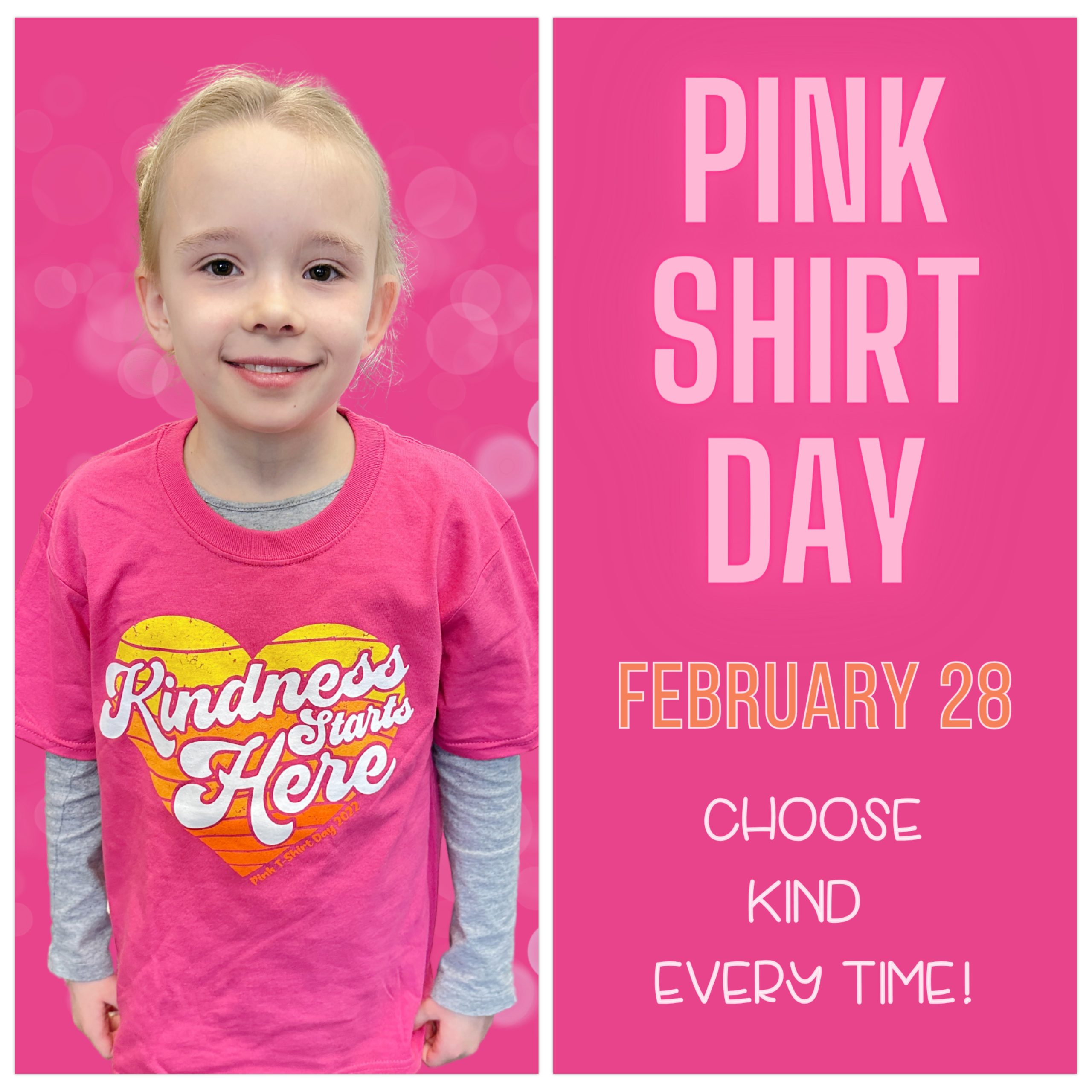 Don’t forget to wear PINK this week!! PINK SHIRT DAY, is an opportunity to stand together in support of being KIND and spreading KINDNESS every day and every where. We encourage and hope to see all students, staff, and parents wearing PINK on Wednesday, FEBRUARY 28!