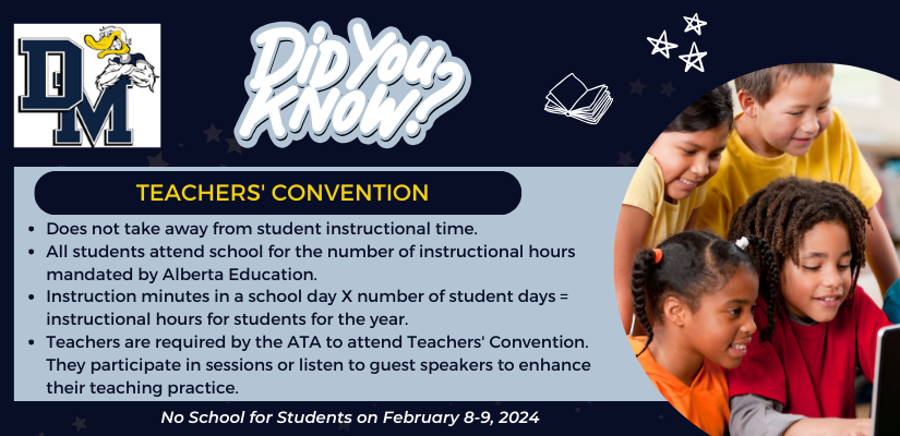 Just a reminder that there is NO SCHOOL for students this coming Thursday and Friday as it is Teachers’ Convention. See image below for additional information.