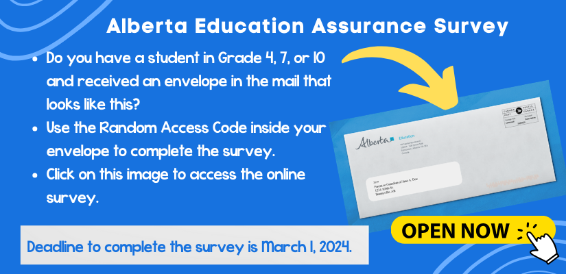 Alberta Education is conducting its annual education surveys. This survey collects information on the quality of education provided by school authorities and their schools. The results help schools and school authorities to develop education plans.