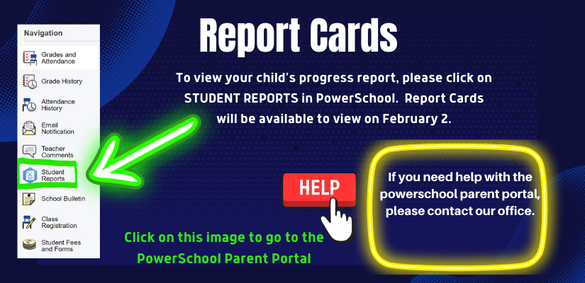 The PowerSchool Parent Portal is open and you should be able to view your child’s report card. If you are having difficulty finding the report card, please see image below for a reminder on how to access the report card. If you have questions about your child’s report card, please reach out to their teacher(s).