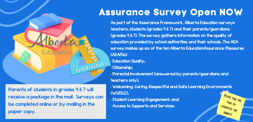 Grade 4 & 7 parents – keep an eye on your mailbox for an important letter from Alberta Education. This letter has the code for you to complete your survey.