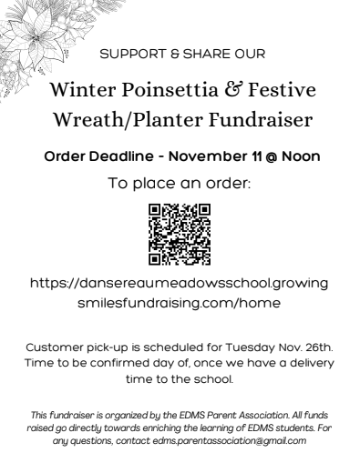 Attention EDMS families – there is only 1 week left to order your Winter Poinsettia’s and Festive Wreaths or Planters. Please visit the WEBSITE to place your orders!