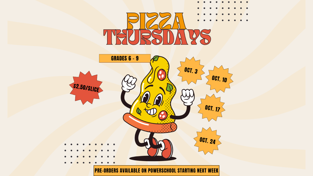 Pizza Thursdays are back, $2.50 per slice! Pizza is available for pre-order for students in grades 6-9. Order forms will be available on PowerSchool starting next week for October 3, 10, 17 & 24th. Please note that this is NOT part of the Hot Lunch program. All orders are placed through PowerSchool and MUST be received by noon on the Wednesday before the Pizza Thursday (i.e. Orders for October 3rd must be received before noon on October 2nd). Please note that your order is not complete until you have paid for your order.