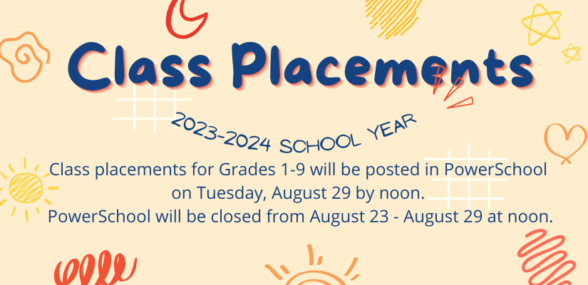 Due to the large number of changes with student enrollment in June and over the summer, class placements for students in Grades 1-9 will be posted in PowerSchool on Tuesday, August 29, 2023 by noon. Please ensure you know how to log into PowerSchool to see your child’s profile. Please note that the PowerSchool parent portal will be closed to parents from August 22- August 25, 2022.